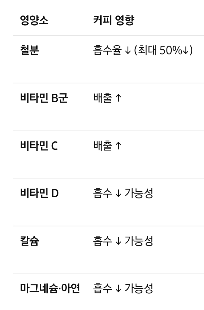 다음 표는 커피와 함께 섭취했을 때 흡수가 떨어지거나 효과가 저하될 수 있는 영양소를 정리한 것입니다.